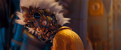 It’s the look of the piece that kept me hooked. The dieselpunk aesthetic was a great choice from director Zhao Ji, offering us an out-of-time fictional world that allows for modern technology but also retains some classical facets in order to sell its more mythical aspects. Reimagining Nezha’s flaming wheels as a motorcycle, replacing Ao Bing’s spine with cyborg enhancements and giving Sun Wukong The Six-Eared Macaque an expression-changing mask are all very cool choices that help sell the world even more. Though that said, I’ll admit that it took a bit of time for me to appreciate Light Chaser’s rendering of its characters. At first, their plasticky look suggested to me that the studio was going for a stop motion look – not unlike what you’d see from Laika. But the more I watched the figures emote and move in frenetic, fast-paced action sequences (backed up by a never-still camera) the more I appreciated the style.